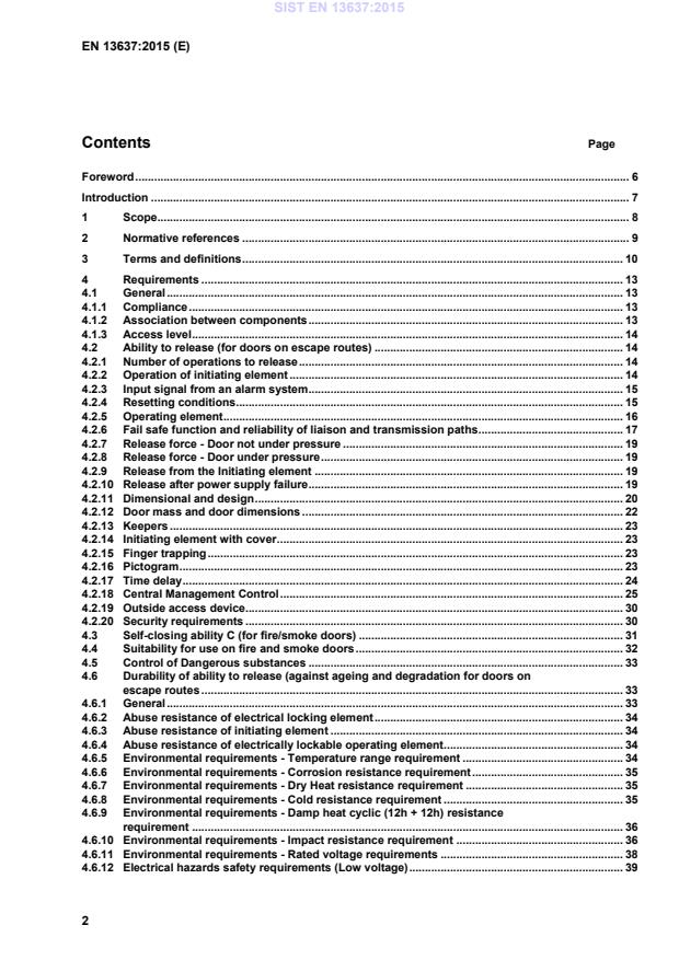 Keywords: SIST EN 13637:2015, electrically controlled exit systems, escape routes, electrical locking element, initiating element, performance requirements, testing methods, fire and smoke doors, durability, EMC, IP rating, AVCP.