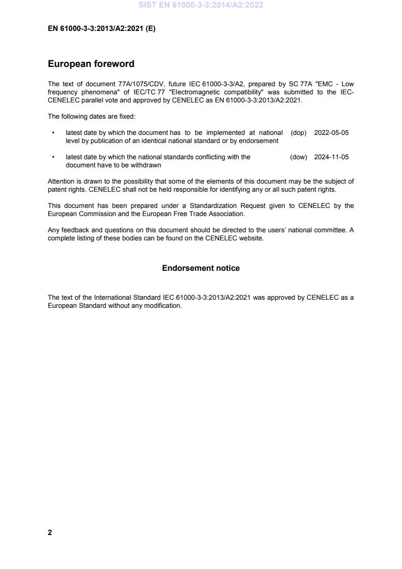 This amendment A2 modifies the European Standard EN 61000-3-3:2013; it was approved by CENELEC on 2021-04-29. CENELEC
