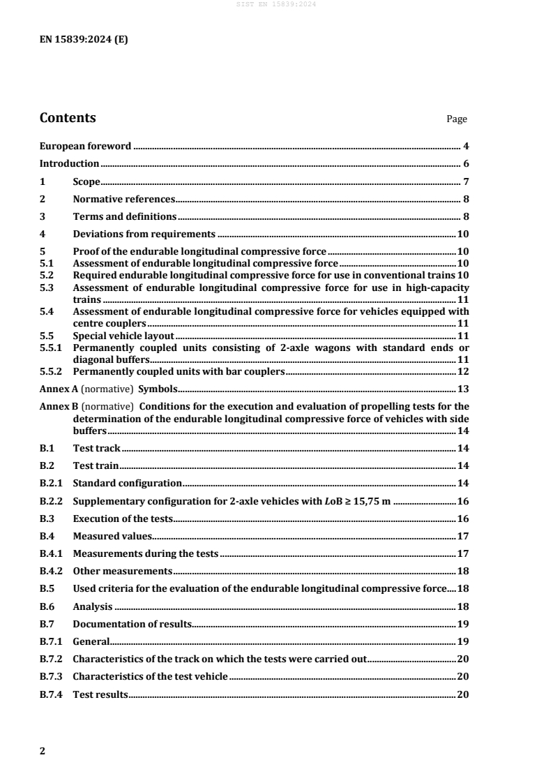 Ta dokument določa ocenjevanje vzdržnih vzdolžnih tlačnih sil (LCF), ki jih lahko prenese vozilo. Parameter vzdržne vzdolžne tlačne sile je odvisen od konstrukcije vozila. Uporablja se za oceno tveganja za iztirjenje zaradi izpostavljenosti tem silam v obratovalnih pogojih.