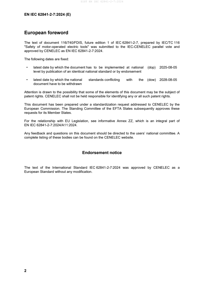 - CENELEC adoption as EN IEC 62841‑2‑7:2024 (national implementation timelines and transitional period recommendations-typically up to 36 months-are indicated in the foreword).