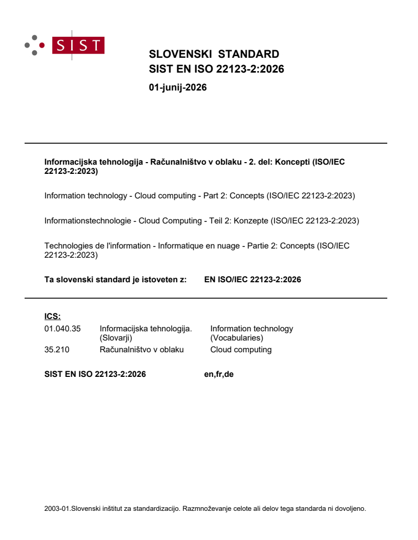 SIST EN ISO 22123-2:2026 is classified under the following ICS (International Classification for Standards) categories: 01.040.35 - Information technology (Vocabularies); 35.210 - Cloud computing. The ICS classification helps identify the subject area and facilitates finding related standards.