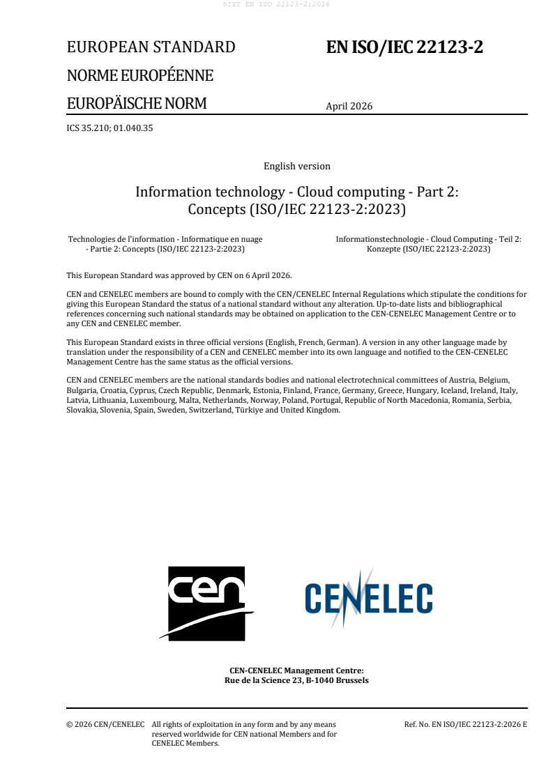 Keywords: ISO/IEC 22123-2, prEN ISO 22123-2, cloud computing concepts, cloud service categories, SaaS PaaS IaaS, cloud deployment models, multi‑cloud, virtualization, cloud security, interoperability, cloud SLA.