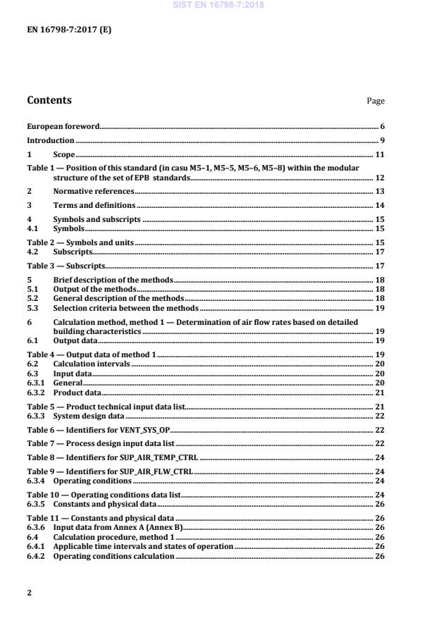 standards . 12 2 Normative references . 13 3 Terms and definitions . 14 4 Symbols and subscripts . 15 4.1 Symbols . 15 Table 2 — Symbols and units . 15 4.2 Subscripts . 17 Table 3 — Subscripts . 17 5 Brief description of the methods . 18 5.1 Output of the methods . 18 5.2 General description of the methods . 18 5.3 Selection criteria between the methods . 19 6 Calculation method, method 1 — Determination of air flow rates based on detailed building characteristics . 19 6.1 Output data . 19 Table 4 — Output data of method 1 . 19 6.2 Calculation intervals . 20 6.3 Input data . 20 6.3.1 General . 20 6.3.2 Product data . 21 Table 5 — Product technical input data list. 21 6.3.3 System design data . 22 Table 6 — Identifiers for VENT_SYS_OP . 22 Table 7 — Process design input data list . 22 Table 8 — Identifiers for SUP_AIR_TEMP_CTRL . 24 Table 9 — Identifiers for SUP_AIR_FLW_CTRL . 24 6.3.4 Operating conditions . 24 Table 10 — Operating conditions data list . 24 6.3.5 Constants and physical data . 26 Table 11 — Constants and physical data . 26 6.3.6 Input data from Annex A (Annex B). 26 6.4 Calculation procedure, method 1 . 26 6.4.1 Applicable time intervals and states of operation . 26 6.4.2 Operating conditions calculation . 26 SIST EN 16798-7:2018