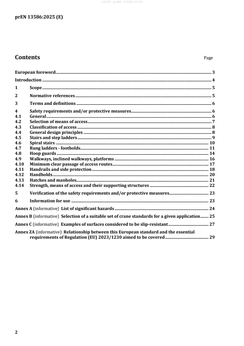 prEN 13586:2025 - "Cranes - Access" (CEN) specifies design requirements for non-powered means of access installed on cranes. It covers access to operator control stations and all access needed for maintenance, and certain erection/dismantling operations. The draft updates EN 13586:2020 and focuses on safe, permanent access features (stairs, ladders, walkways, platforms, hoop guards) while excluding slidable/retractable access (except movable hoop guards) and lighting requirements. The standard is intended as a harmonized European (type-C) standard to support conformity with Machinery Regulation requirements.