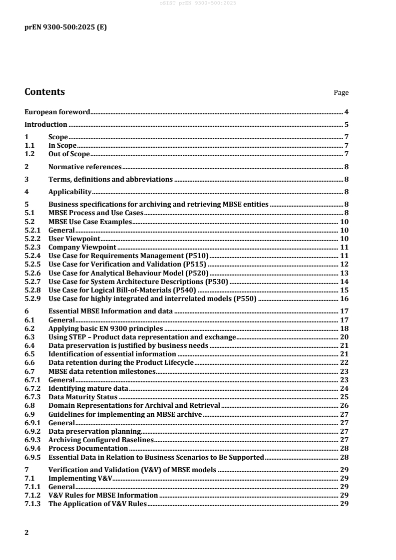 1.1 In Scope The EN 9300-5xx series specifies the methods for long term archiving and retrieval of MBSE data represented as digital models. The characterization of models that are considered in scope of this document and the MBSE process use cases include: - product or system design requirements models; - functional architecture models; - logical architecture models (system structure, arrangement, connectivity, software allocations and controls, and part relationships); - numerically-based system analysis and simulation models, generally regulated 1D control loop models featuring system components and transport elements (tubing, piping, signalling, software); - verification and validation of requirements; - protocol dependent signal or communication networks; - multi-model linking and system parametric models; - system trade study models; - the solution architecture models and data that are needed to implement the system and generate system engineering data for downstream designs. 1.2 Out of Scope The EN 9300-5xx series does not address the original product model design process, or a specific configuration management process for the LOTAR archive. It does not address models depicting part specific technical data (physical materials or detail part standards). It is assumed that these archiving processes are within the scope of other parts of the EN 9300 series such as the 1xx series for CAD, the 2xx series for Product Data Management (PDM) data, or by applying existing alternative industry standards, or existing company business procedures. Typical models and capabilities considered out of scope of this document include: - physical spatial models or composite structures (as described by other LOTAR Parts); - Finite Element and CFD models (as described by other LOTAR Parts); - Product Data Management models (as described by other LOTAR Parts); - electrical circuit boards, or physical wiring parts or systems (described by other LOTAR Parts or standards); - the software development process and software models that are outside of the context of software parts, behaviours, or functions that represent software code within a model; - how to preserve property and access rights, or government acquisition-regulatory controls; - new standards, or major revisions to existing MBSE standards that were not available or applicable prior to the publication of this document.