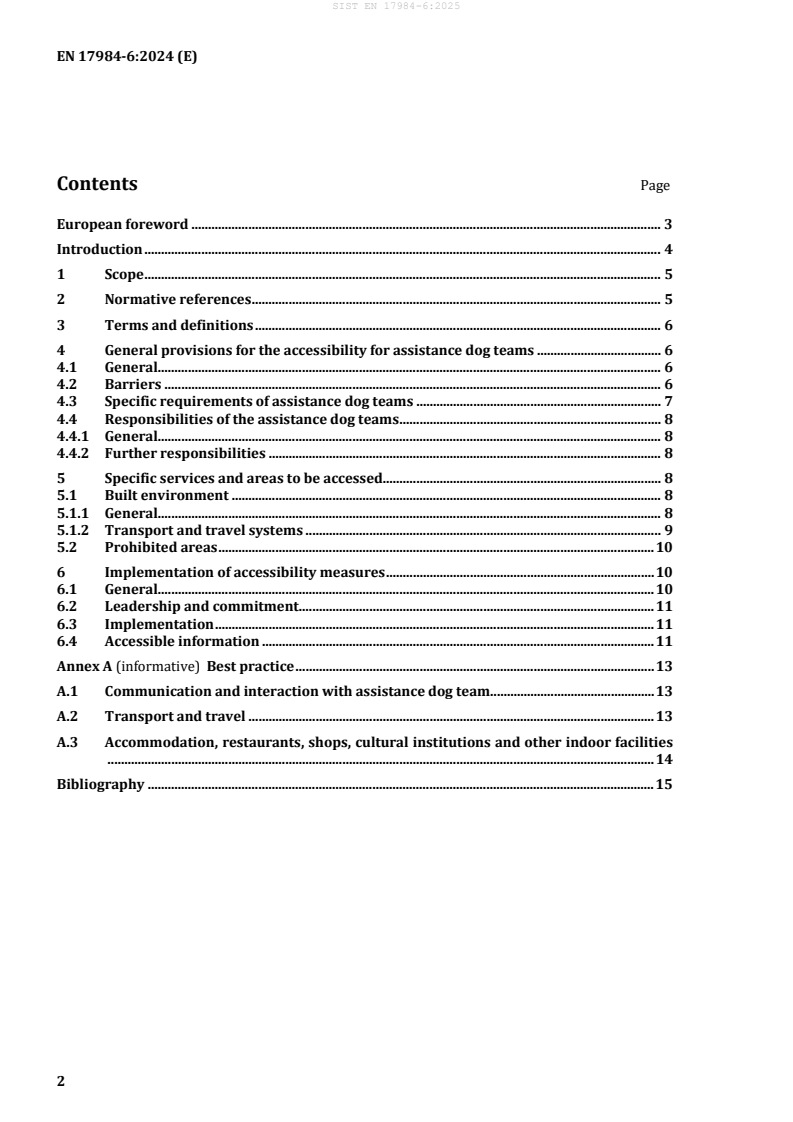 This document specifies requirements and recommendations for the accessibility of public and private spaces and universal access for assistance dog teams in an active status. The accessibility requirements and recommendations for assistance dog teams in this document are applicable across the full spectrum of the built environment both indoor and outdoor (e.g. social service, medical and educational facilities, public institutions, cultural venues, sporting venues, hotel accommodation, public transport, parks, nature reserves). The purpose of this document is to improve the accessibility for assistance dog teams ensuring their rights under the United Nations Convention on the Rights of Persons with Disabilities, so that they have the same opportunities as all citizens and can participate independently in all areas of life. This document provides: - specific requirements of assistance dog teams to support accessibility and to achieve universal access; - responsibilities of assistance dog teams to enhance the public acceptance of assistance dogs; - guidance for specific services and areas to be accessed; - guidance for the implementation of accessibility measures at public and private bodies responsible for the built environment including transport and travel systems. This document includes all private spaces where the public are generally admitted, or where the public can be accommodated (e.g. office buildings, waiting rooms, common areas of apartment buildings). This document can be applied to improve accessibility of assistance dog teams in the workplace. This document can be applied to assistance dogs in training and puppies preparing for an assistance dog role.