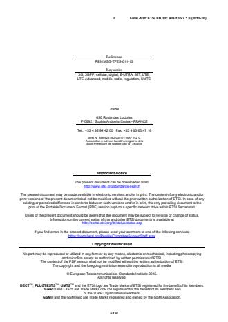 ETSI ETSI EN 301 908-13 V7.1.1 (2015-12)8 Intellectual Property Rights IPRs essential or potentially essential to the present document may have been declared to ETSI. The information pertaining to these essential IPRs, if any, is publicly available for ETSI members and non-members, and can be found in ETSI SR 000 314: "Intellectual Property Rights (IPRs); Essential, or potentially Essential, IPRs notified to ETSI in respect of ETSI standards", which is available from the ETSI Secretariat. Latest updates are available on the ETSI Web server (http://ipr.etsi.org). Pursuant to the ETSI IPR Policy, no investigation, including IPR searches, has been carried out by ETSI. No guarantee can be given as to the existence of other IPRs not referenced in ETSI SR 000 314 (or the updates on the ETSI Web server) which are, or may be, or may become, essential to the present document. Foreword This Harmonised European Standard (EN) has been produced by ETSI Technical Committee Mobile Standards Group (MSG). The present document has been produced by ETSI in response to mandates M/284 and M/406 issued from the European Commission under Directive 98/34/EC [i.1] as amended by Directive 98/48/EC [i.10]. The title and reference to the present document are intended to be included in the publication in the Official Journal of the European Union of titles and references of Harmonised Standard under the Directive 1999/5/EC [i.2]. The requirements relevant to Directive 1999/5/EC [i.2] are summarized in annex A. The present document is part 13 of a multi-part deliverable. Full details of the entire series can be found in part 1 [i.13].