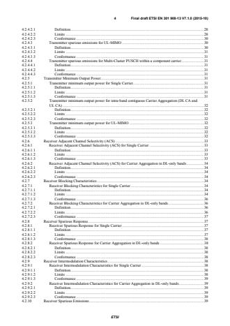 ETSI ETSI EN 301 908-13 V7.1.1 (2015-12)7 5.3.10.2.1 Method of test . 70 5.3.10.2.2 Test requirements . 71 5.3.10.3 Transmitter adjacent channel leakage power ratio for UL-MIMO . 71 5.3.10.3.1 Method of test . 71 5.3.10.3.2 Test requirements . 72 5.3.10.4 Transmitter adjacent channel leakage power ratio for Multi-Cluster PUSCH within a component carrier . 72 5.3.10.4.1 Method of test . 72 5.3.10.4.2 Test requirements . 73 Annex A (normative): HS Requirements and conformance Test specifications Table (HS-RTT) . 74 Annex B (normative): Environmental profile . 76 B.1 General . 76 B.1.1 Introduction . 76 B.1.2 Temperature . 76 B.1.3 Voltage . 76 B.1.4 Test environment . 77 Annex C: Void . 78 Annex D (informative): Bibliography . 79 History . 80