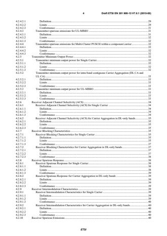 ETSI ETSI EN 301 908-13 V7.1.1 (2015-12)4 4.2.4.2.1 Definition. 28 4.2.4.2.2 Limits . 28 4.2.4.2.3 Conformance . 30 4.2.4.3 Transmitter spurious emissions for UL-MIMO . 30 4.2.4.3.1 Definition. 30 4.2.4.3.2 Limits . 31 4.2.4.3.3 Conformance . 31 4.2.4.4 Transmitter spurious emissions for Multi-Cluster PUSCH within a component carrier . 31 4.2.4.4.1 Definition. 31 4.2.4.4.2 Limits . 31 4.2.4.4.3 Conformance . 31 4.2.5 Transmitter Minimum Output Power . 31 4.2.5.1 Transmitter minimum output power for Single Carrier. 31 4.2.5.1.1 Definition. 31 4.2.5.1.2 Limits . 31 4.2.5.1.3 Conformance . 31 4.2.5.2 Transmitter minimum output power for intra-band contiguous Carrier Aggregation (DL CA and UL CA) . 32 4.2.5.2.1 Definition. 32 4.2.5.2.2 Limits . 32 4.2.5.2.3 Conformance . 32 4.2.5.3 Transmitter minimum output power for UL-MIMO . 32 4.2.5.3.1 Definition. 32 4.2.5.3.2 Limits . 32 4.2.5.3.3 Conformance . 32 4.2.6 Receiver Adjacent Channel Selectivity (ACS) . 33 4.2.6.1 Receiver Adjacent Channel Selectivity (ACS) for Single Carrier . 33 4.2.6.1.1 Definition. 33 4.2.6.1.2 Limits . 33 4.2.6.1.3 Conformance . 33 4.2.6.2 Receiver Adjacent Channel Selectivity (ACS) for Carrier Aggregation in DL-only bands . 34 4.2.6.2.1 Definition. 34 4.2.6.2.2 Limits . 34 4.2.6.2.3 Conformance . 34 4.2.7 Receiver Blocking Characteristics . 34 4.2.7.1 Receiver Blocking Characteristics for Single Carrier . 34 4.2.7.1.1 Definition. 34 4.2.7.1.2 Limits . 34 4.2.7.1.3 Conformance . 36 4.2.7.2 Receiver Blocking Characteristics for Carrier Aggregation in DL-only bands . 36 4.2.7.2.1 Definition. 36 4.2.7.2.2 Limits . 36 4.2.7.2.3 Conformance . 37 4.2.8 Receiver Spurious Response . 37 4.2.8.1 Receiver Spurious Response for Single Carrier . 37 4.2.8.1.1 Definition. 37 4.2.8.1.2 Limits . 37 4.2.8.1.3 Conformance . 38 4.2.8.2 Receiver Spurious Response for Carrier Aggregation in DL-only bands . 38 4.2.8.2.1 Definition. 38 4.2.8.2.2 Limits . 38 4.2.8.2.3 Conformance . 38 4.2.9 Receiver Intermodulation Characteristics . 38 4.2.9.1 Receiver Intermodulation Characteristics for Single Carrier . 38 4.2.9.1.1 Definition. 38 4.2.9.1.2 Limits . 38 4.2.9.1.3 Conformance . 39 4.2.9.2 Receiver Intermodulation Characteristics for Carrier Aggregation in DL-only bands . 39 4.2.9.2.1 Definition. 39 4.2.9.2.2 Limits . 39 4.2.9.2.3 Conformance . 39 4.2.10 Receiver Spurious Emissions . 39 SIST EN 301 908-13 V7.1.1:2016