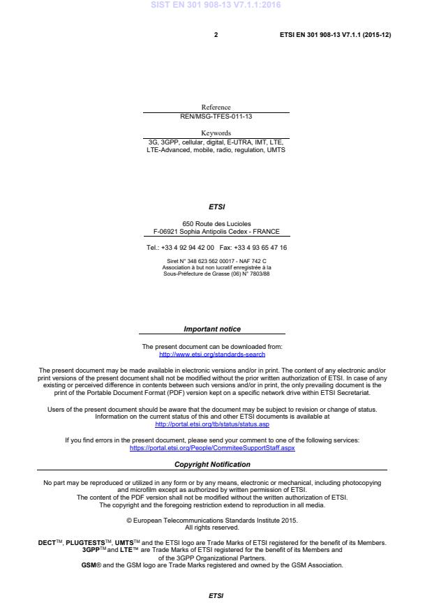 DECTTM, PLUGTESTSTM, UMTSTM and the ETSI logo are Trade Marks of ETSI registered for the benefit of its Members. 3GPPTM and LTE™ are Trade Marks of ETSI registered for the benefit of its Members and of the 3GPP Organizational Partners. GSM® and the GSM logo are Trade Marks registered and owned by the GSM Association. SIST EN 301 908-13 V7.1.1:2016