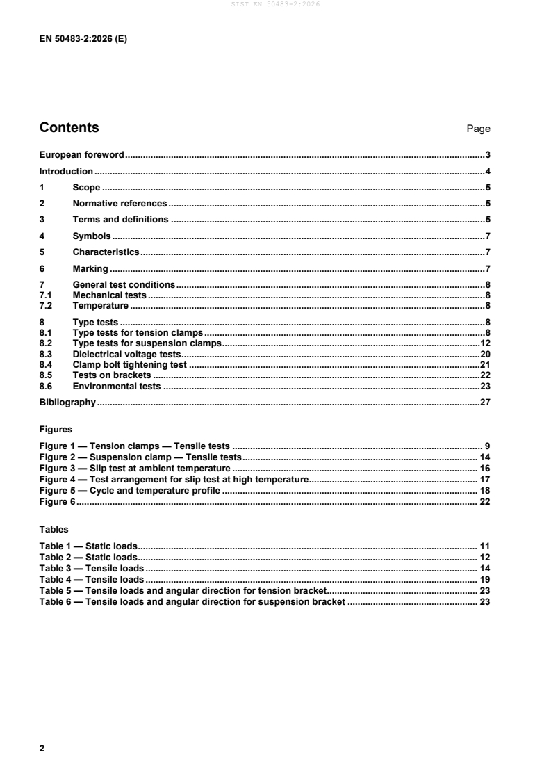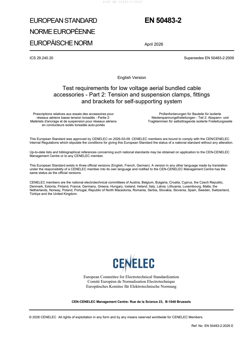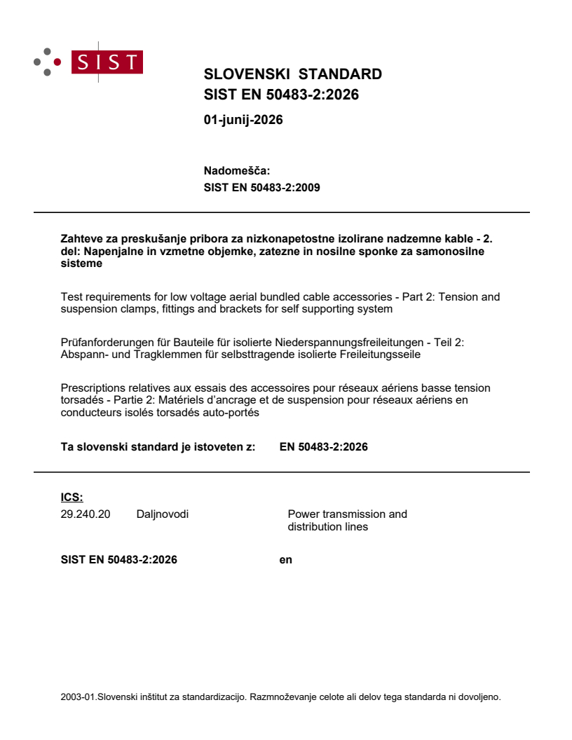 SIST EN 50483-2:2026 is a standard published by the Slovenian Institute for Standardization (SIST). Its full title is "Test requirements for low voltage aerial bundled cable accessories - Part 2: Tension and suspension clamps, fittings and brackets for self supporting system". This standard covers: The EN 50483 series applies to overhead line fittings for tensioning, supporting and connecting aerial bundled cables (ABC) of rated voltage U0/U (Um): 0,6/1 (1,2) kV. This document applies to tensioning devices consisting of tension and suspension clamps, fittings and brackets designed to be used for installation of self-supporting ABC defined in HD 626 S2. Tests described in this document are type tests.