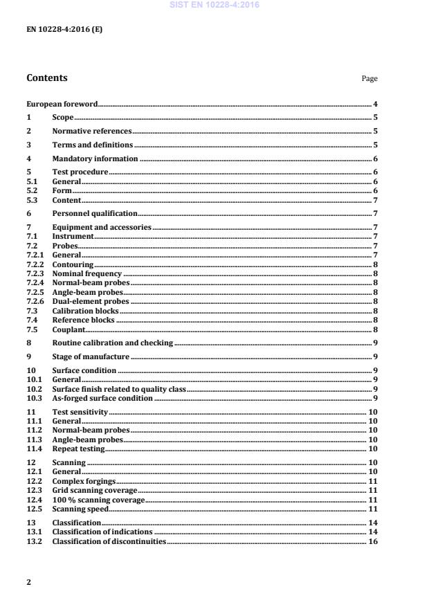 European foreword . 4 1 Scope . 5 2 Normative references . 5 3 Terms and definitions . 5 4 Mandatory information . 6 5 Test procedure . 6 5.1 General . 6 5.2 Form . 6 5.3 Content . 7 6 Personnel qualification . 7 7 Equipment and accessories . 7 7.1 Instrument . 7 7.2 Probes. 7 7.2.1 General . 7 7.2.2 Contouring . 8 7.2.3 Nominal frequency . 8 7.2.4 Normal-beam probes . 8 7.2.5 Angle-beam probes . 8 7.2.6 Dual-element probes . 8 7.3 Calibration blocks . 8 7.4 Reference blocks . 8 7.5 Couplant. 8 8 Routine calibration and checking . 9 9 Stage of manufacture . 9 10 Surface condition . 9 10.1 General . 9 10.2 Surface finish related to quality class . 9 10.3 As-forged surface condition . 9 11 Test sensitivity . 10 11.1 General . 10 11.2 Normal-beam probes . 10 11.3 Angle-beam probes . 10 11.4 Repeat testing . 10 12 Scanning . 10 12.1 General . 10 12.2 Complex forgings . 11 12.3 Grid scanning coverage . 11 12.4 100 % scanning coverage . 11 12.5 Scanning speed . 11 13 Classification . 14 13.1 Classification of indications . 14 13.2 Classification of discontinuities . 16 SIST EN 10228-4:2016