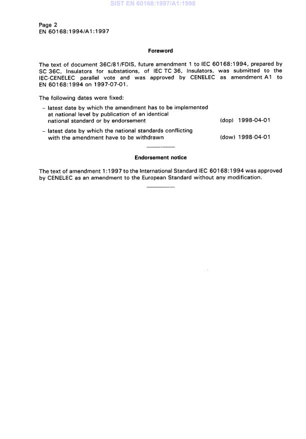 - IEC/EN standards on insulators and high-voltage equipment (for cross-reference and normative citation). The amendment also updates bibliography entries (e.g., reference to IEC 61264:1994) and renumbers other references as specified.