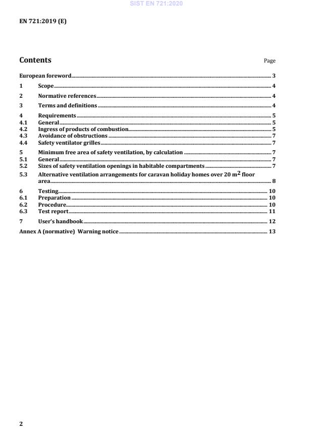 EN 721:2019 - Leisure accommodation vehicles - Safety ventilation requirements (CEN) specifies the minimum safety ventilation requirements for leisure accommodation vehicles such as caravans, motorcaravans and caravan holiday homes. The standard defines how to calculate or verify safety ventilation by testing, sets siting rules for flue terminals and ventilators, and requires user information and warning labelling where applicable. It was prepared by CEN/TC 245 and supersedes the 2004 edition.