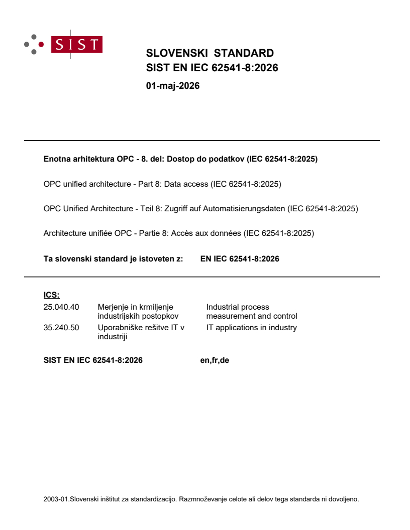 SIST EN IEC 62541-8:2026 is a standard published by the Slovenian Institute for Standardization (SIST). Its full title is "OPC unified architecture - Part 8: Data access (IEC 62541-8:2025)". This standard covers: This part of IEC 62541 is part of the overall OPC Unified Architecture (OPC UA) standard series and defines the information model associated with Data Access (DA). It particularly includes additional VariableTypes and complementary descriptions of the NodeClasses and Attributes needed for Data Access, additional Properties, and other information and behaviour. The complete address space model, including all NodeClasses and Attributes is specified in IEC 62541-3. The services to detect and access data are specified in IEC 62541-4. Annex A specifies how the information received from OPC COM Data Access (DA) Servers is mapped to the Data Access model.