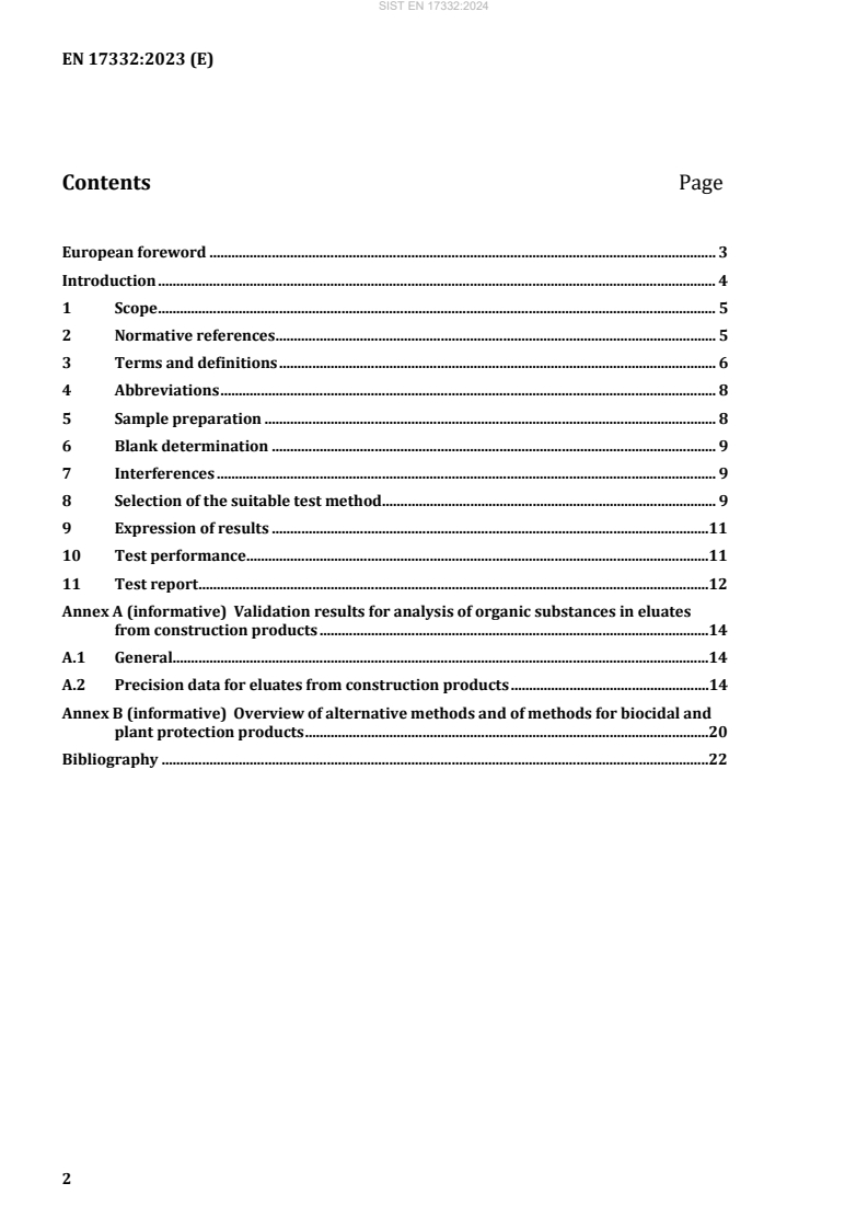 - Scope: Defines methods for analyzing organic substances in eluates from leaching of construction products and sets requirements for sample preparation, blank determination, interferences, method selection, result expression, test performance and reporting.