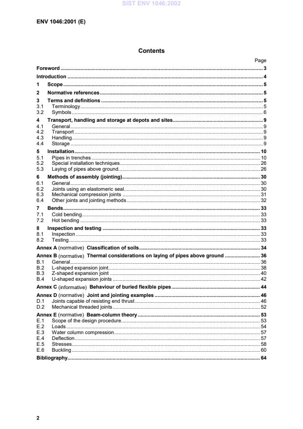 SIST ENV 1046:2002 is a standardization document published by the Slovenian Institute for Standardization (SIST). Its full title is "Plastics piping and ducting systems - Systems outside building structures for the conveyance of water or sewage - Practices for installation above and below ground". This standard covers: This prestandard is applicable to the installation of plastics piping systems to be used for the conveyance of water or sewage under gravity and pressure conditions above and below ground. It is intended to be used for pipes of nominal size up to and including DN 3000. Where in this prestandard the term "pipe" is used then it serves also to cover any "fittings", "ancillary" products and "components". NOTE 1 It is assumed that additional recommendations and/or requirements are detailed in the individual materials System Standards. Instances where this is expected to apply include those indicated in this prestandard as follows: a) any special transportation requirements (see 4.2.6); b) maximum storage height (see 4.4.3 and 4.4.4); c) maximum storage period in direct sunlight (see 4.4.6); d) any climatic conditions requiring special storage (see 4.4.7); e) limiting initial and/or long-term deflections (see 5.1.1 and 5.1.2); f) information on mole ploughing and boring (see and 5.2), if applicable; g) longitudinal tensile modulus and strength (see 5.3.1.2); h) coefficient of thermal linear expansion (see 5.3.2.2 and Annex B); i) suitability for use in areas exposed to sunlight (see 5.3.3); j) selection of appropriate jointing system (see clause 6); k) recommended radii of curvature for cold bending (see 7.1); l) permitted rates of loss of water under test (see 8.2.1); m) if applicable the relationship between SDR and stiffness. NOTE 2 Guidance and instructions concerning commissioning of systems can be found in the standards prepared by CEN/TC 164 and by CEN/TC 165 and the relevant national and/or local regulations. NOTE 3 Concerning the character of this document see Foreword and Introduction.