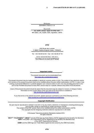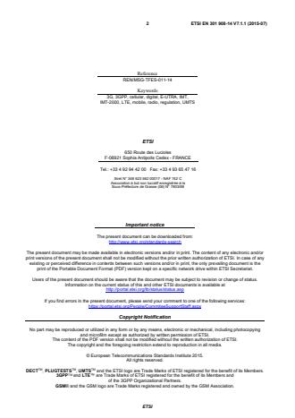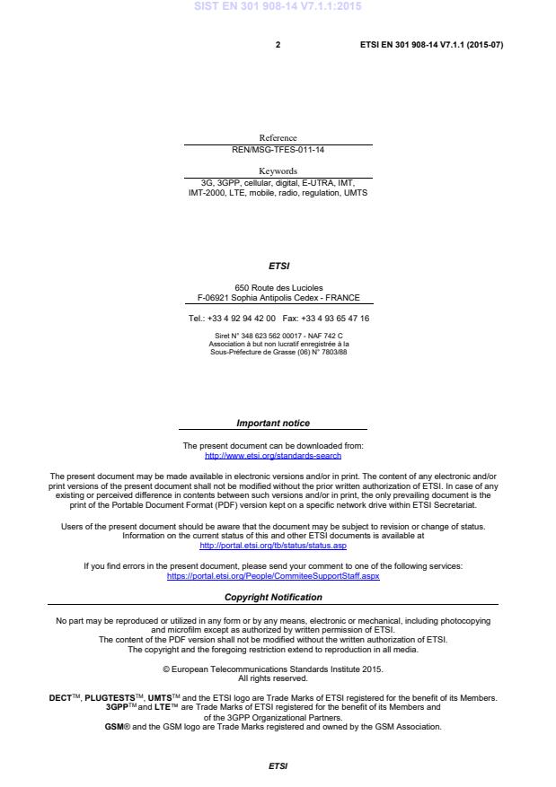 DECTTM, PLUGTESTSTM, UMTSTM and the ETSI logo are Trade Marks of ETSI registered for the benefit of its Members. 3GPPTM and LTE™ are Trade Marks of ETSI registered for the benefit of its Members and of the 3GPP Organizational Partners. GSM® and the GSM logo are Trade Marks registered and owned by the GSM Association. SIST EN 301 908-14 V7.1.1:2015