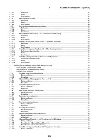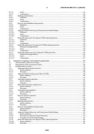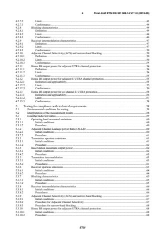 ETSI ETSI EN 301 908-14 V7.1.1 (2015-07)4 4.2.7.2 Limit . 43 4.2.7.3 Conformance . 43 4.2.8 Blocking characteristics . 44 4.2.8.1 Definition . 44 4.2.8.2 Limit . 44 4.2.8.3 Conformance . 46 4.2.9 Receiver intermodulation characteristics . 47 4.2.9.1 Definition . 47 4.2.9.2 Limit . 47 4.2.9.3 Conformance . 50 4.2.10 Adjacent Channel Selectivity (ACS) and narrow-band blocking . 50 4.2.10.1 Definition . 50 4.2.10.2 Limit . 50 4.2.10.3 Conformance . 54 4.2.11 Home BS output power for adjacent UTRA channel protection. 54 4.2.11.1 Definition . 54 4.2.11.2 Limit . 54 4.2.11.3 Conformance . 55 4.2.12 Home BS output power for adjacent E-UTRA channel protection . 55 4.2.12.1 Definition and applicability . 55 4.2.12.2 Limit . 55 4.2.12.3 Conformance . 56 4.2.13 Home BS output power for co-channel E-UTRA protection . 56 4.2.13.1 Definition and applicability . 56 4.2.13.2 Limit . 56 4.2.13.3 Conformance . 57 5 Testing for compliance with technical requirements . 57 5.1 Environmental conditions for testing . 57 5.2 Interpretation of the measurement results . 58 5.3 Essential radio test suites . 59 5.3.1 Operating band unwanted emissions . 59 5.3.1.1 Initial conditions . 59 5.3.1.2 Procedure . 60 5.3.2 Adjacent Channel Leakage power Ratio (ACLR) . 60 5.3.2.1 Initial conditions . 60 5.3.2.2 Procedure . 61 5.3.3 Transmitter spurious emissions . 61 5.3.3.1 Initial conditions . 61 5.3.3.2 Procedure . 62 5.3.4 Base Station maximum output power . 62 5.3.4.1 Initial conditions . 62 5.3.4.2 Procedure . 62 5.3.5 Transmitter intermodulation . 63 5.3.5.1 Initial conditions . 63 5.3.5.2 Procedures . 63 5.3.6 Receiver spurious emissions . 64 5.3.6.1 Initial conditions . 64 5.3.6.2 Procedure . 64 5.3.7 Blocking characteristics . 65 5.3.7.1 Initial conditions . 65 5.3.7.2 Procedure . 65 5.3.8 Receiver intermodulation characteristics . 66 5.3.8.1 Initial conditions . 66 5.3.8.2 Procedures . 66 5.3.9 Adjacent Channel Selectivity (ACS) and narrow-band blocking . 67 5.3.9.1 Initial conditions . 67 5.3.9.2 Procedure for Adjacent Channel Selectivity . 67 5.3.9.3 Procedure for narrow-band blocking . 67 5.3.10 Home BS output power for adjacent UTRA channel protection. 68 5.3.10.1 Initial conditions . 68 5.3.10.2 Procedure . 68 SIST EN 301 908-14 V7.1.1:2015