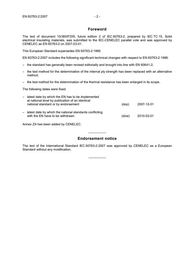 IEC 60763-2:2007 gives methods of test applicable for the material classified in IEC 60763-1. This edition includes the following significant technical changes with respect to the previous edition: The standard has generally been revised editorially and brought into line with IEC 60641-2; The test method for the determination of the internal ply strength has been replaced with an alternative method; and The test method for the determination of the thermal resistance has been enlarged in its scope.