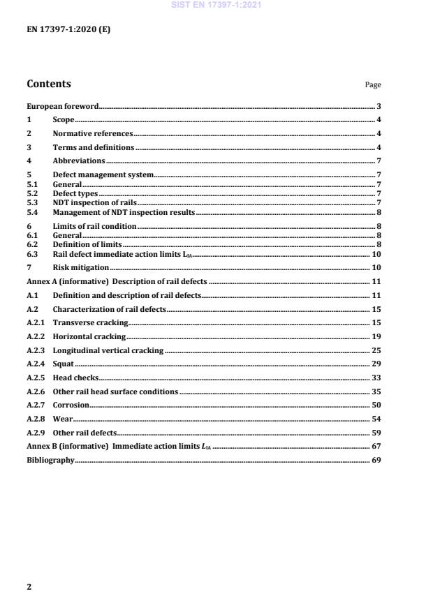 SIST EN 17397-1:2021 (EN 17397-1:2020) defines a structured rail defect management system for infrastructure managers to control the risk of severe accidents caused by internal or surface rail defects. The standard applies to plain rails that comply with EN 13674-1, EN 13674-2, EN 13674-4 and EN 15689:2009, while grooved rails (EN 14811) are excluded and require alternative systems. It sets out the framework for inspection, classification, limits of rail condition and risk mitigation measures to manage rail degradation from detection to removal.