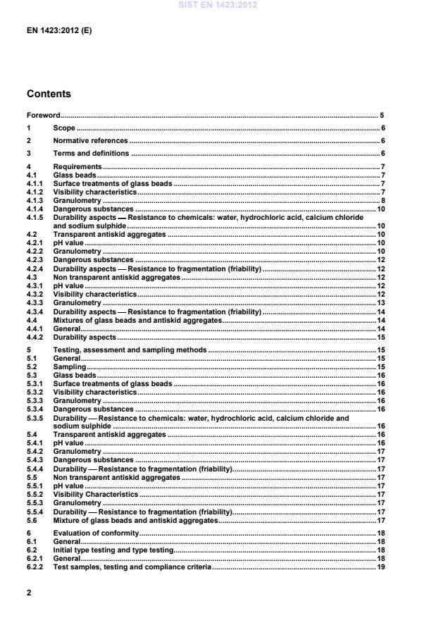 The granulometry of non transparent antiskid aggregates shall be determined in accordance with 5.5.3. 4.3.4 Durability aspects Resistance to fragmentation (friability) Resistance to fragmentation is indicated by the friability index. The friability index of non transparent antiskid aggregates shall be determined in accordance with 5.5.4 and the maximum value of the friability index shall be declared. The compliance with the durability test is presumed to retain the performances stated for the requirements. 4.4 Mixtures of glass beads and antiskid aggregates 4.4.1 General The characteristics of a mixture of glass beads and anti-skid aggregates and their requirements, together with their test methods and the way of expression their results, shall be determined separately for glass beads and antiskid aggregated in the following way: − for glass beads: according to entire 4.1; − for transparent antiskid aggregates: according to entire 4.2; − for non transparent antiskid aggregates according to entire 4.3. SIST EN 1423:2012
