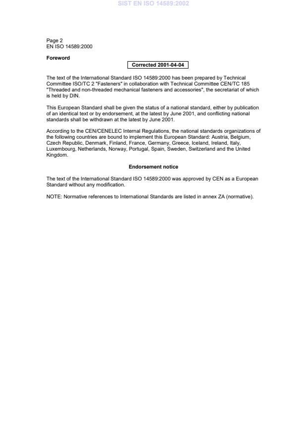 International Standard ISO 14589 was prepared by Technical Committee ISO/TC 2, Fasteners.