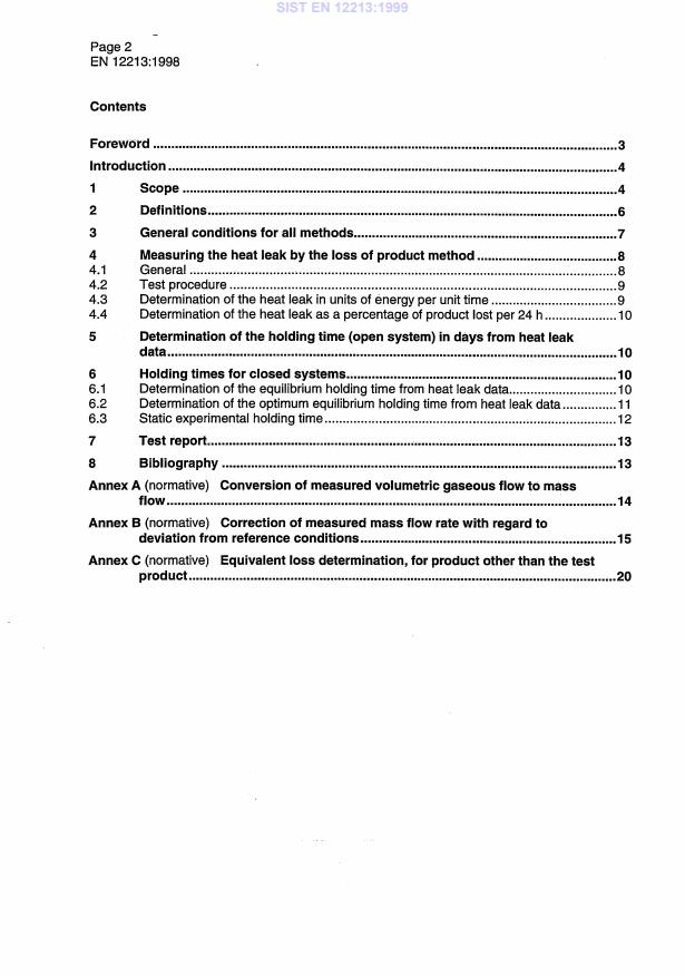 SIST EN 12213:1999 is a standard published by the Slovenian Institute for Standardization (SIST). Its full title is "Cryogenic vessels - Methods for performance evaluation of thermal insulation". This standard covers: This standard defines a pratical method for determining the heat leak performance of cryogenic vessels. The methods include measurement on both open and closed systems. This standard neither specify the requirement levels for insulation performance nor when the methodology defined is applied. These requirements may be defined in design or operational standards/regulations.