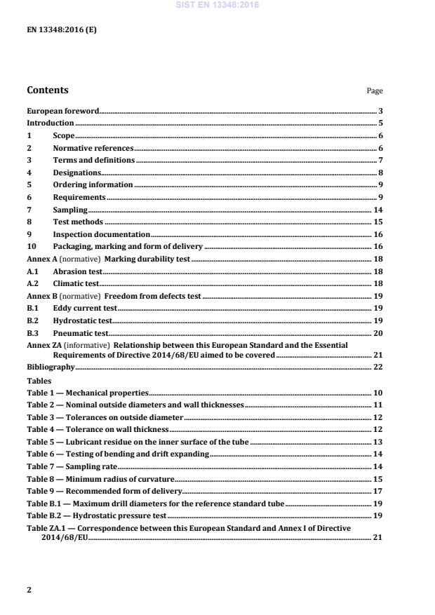 Relationship between this European Standard and the Essential Requirements of Directive 2014/68/EU aimed to be covered . 21 Bibliography . 22 Tables Table 1 — Mechanical properties . 10 Table 2 — Nominal outside diameters and wall thicknesses . 11 Table 3 — Tolerances on outside diameter . 12 Table 4 — Tolerance on wall thickness . 12 Table 5 — Lubricant residue on the inner surface of the tube . 13 Table 6 — Testing of bending and drift expanding . 14 Table 7 — Sampling rate . 14 Table 8 — Minimum radius of curvature . 15 Table 9 — Recommended form of delivery. 17 Table B.1 — Maximum drill diameters for the reference standard tube . 19 Table B.2 — Hydrostatic pressure test . 19 Table ZA.1 — Correspondence between this European Standard and Annex I of Directive 2014/68/EU . 21