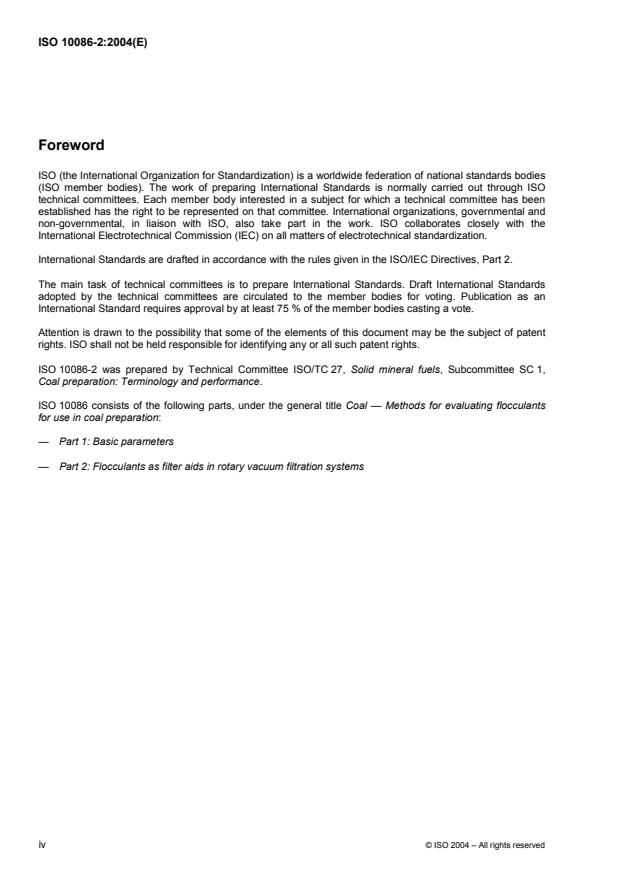 ISO 10086-2:2004 - "Coal - Methods for evaluating flocculants for use in coal preparation - Part 2" defines a laboratory method for the comparative evaluation of flocculants as filter aids in rotary vacuum filtration systems. The standard specifies how to prepare flocculant solutions, dose a representative coal slurry, run a bench-scale rotary vacuum filter-leaf test and quantify performance using cake yield, cake moisture and filtrate clarity. It is intended to simulate plant rotary vacuum filter conditions for meaningful comparison of flocculant performance.