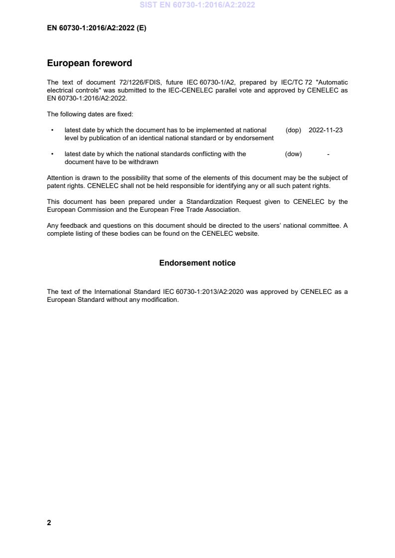 This amendment A2 modifies the European Standard EN 60730-1:2016; it was approved by CENELEC on 2022-02-23. CENELEC