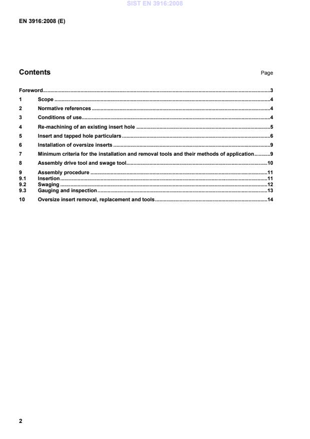 SIST EN 3916:2008 is a standard published by the Slovenian Institute for Standardization (SIST). Its full title is "Aerospace series - Insert, thin wall - Salvage procedure for components". This standard covers: 1.1 This specification covers the accepted methods for the reclamation of installation holes for standard thin wall inserts, within assemblies. 1.2 To enable rectification when defects or damage occur to the standard insert tapped installation hole, or to rectify any out of position of the hole within the specified parameters of use. 1.3 To control the machining of the existing insert hole and the installation requirements of the replacement oversize thin wall insert.
