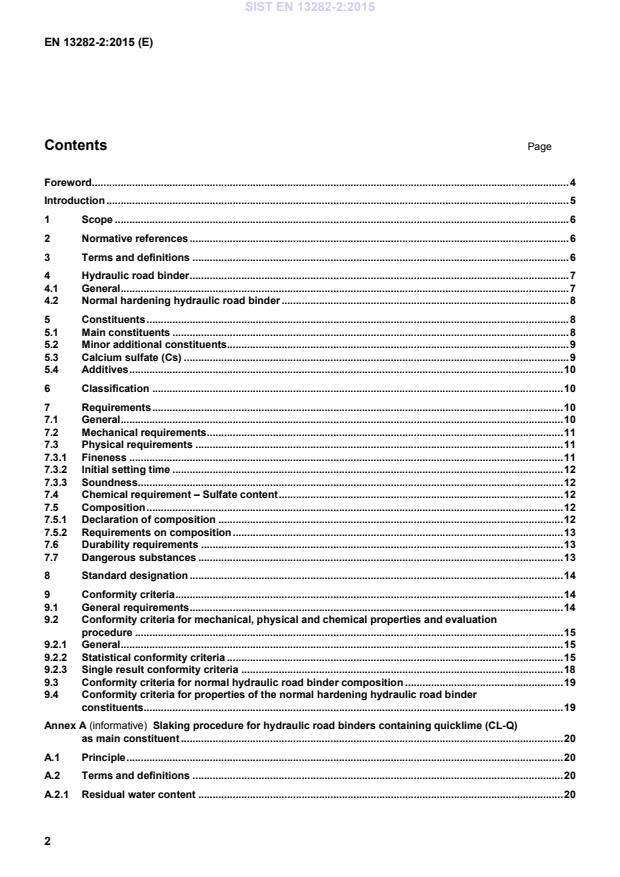 Slaking procedure for hydraulic road binders containing quicklime (CL-Q) as main constituent . 20 A.1 Principle . 20 A.2 Terms and definitions . 20 A.2.1 Residual water content . 20 SIST EN 13282-2:2015
