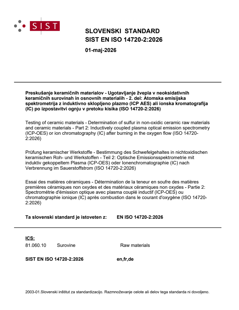 Preskušanje keramičnih materialov - Ugotavljanje žvepla v neoksidativnih keramičnih surovinah in osnovnih materialih - 2. del: Atomska emisijska spektrometrija z induktivno sklopljeno plazmo (ICP AES) ali ionska kromatografija (IC) po izpostavitvi ognju v pretoku kisika (ISO 14720-2:2026)