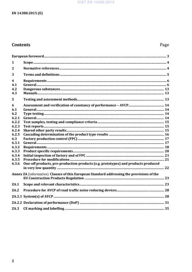 Clauses of this European Standard addressing the provisions of the EU Construction Products Regulation . 23 ZA.1 Scope and relevant characteristics . 23 ZA.2 Procedure for AVCP of road traffic noise reducing devices . 28 ZA.2.1 System(s) of AVCP . 28 ZA.2.2 Declaration of performance (DoP) . 31 ZA.3 CE marking and labelling . 35