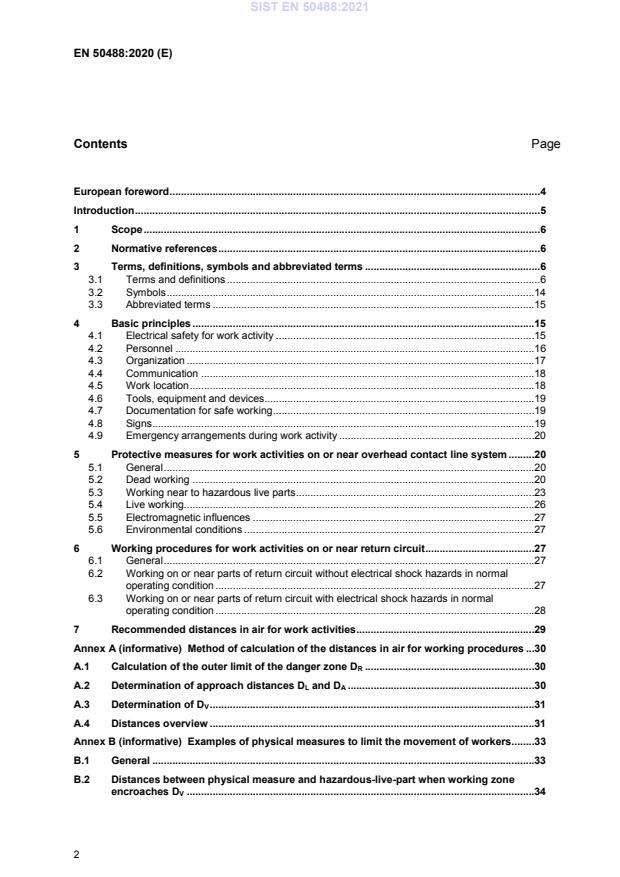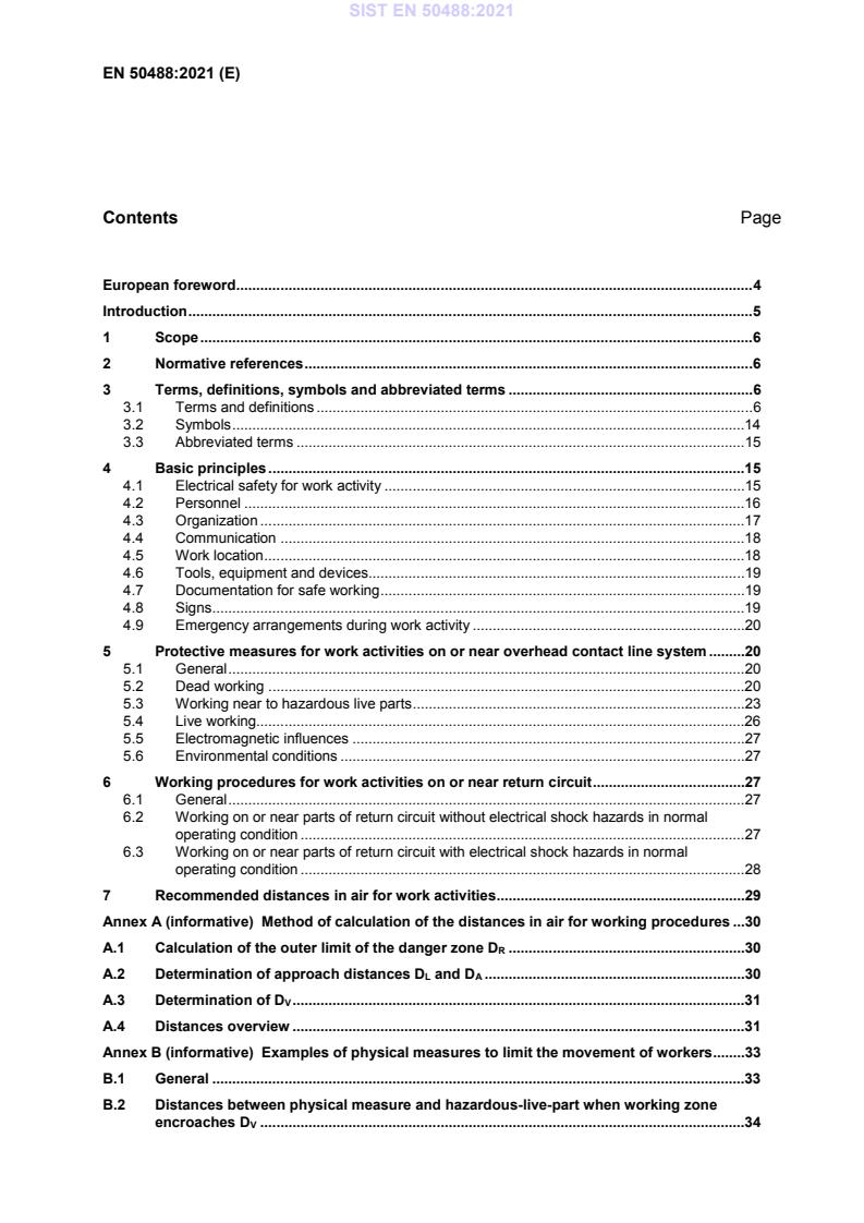SIST EN 50488:2021 is a standard published by the Slovenian Institute for Standardization (SIST). Its full title is "Railway applications - Fixed Installations - Electrical protective measures for working on or near an overhead contact line system and/or its associated return circuit". This standard covers: This document provides requirements for electrical safety for: - dead working on an overhead contact line system; - working activities near an overhead contact line system when it is live. It applies to all work activities in relation to electrical hazards only. This document is applicable to overhead contact line systems with the following nominal voltages: - 1,5 kV and 3 kV dc; - 15 kV, 2x15 kV, 25 kV and 2x25 kV ac. It also provides requirements for work activities that can give rise to electrical hazards from the return circuit. This document does not cover electrical risk arising from: - live working on overhead contact line systems (live working can be carried out according to national requirements and practices); - working on or near other electrical sources. If there are no other rules or procedures, this document could be applied to overhead contact line systems with other nominal voltages.
