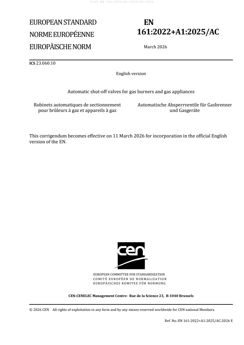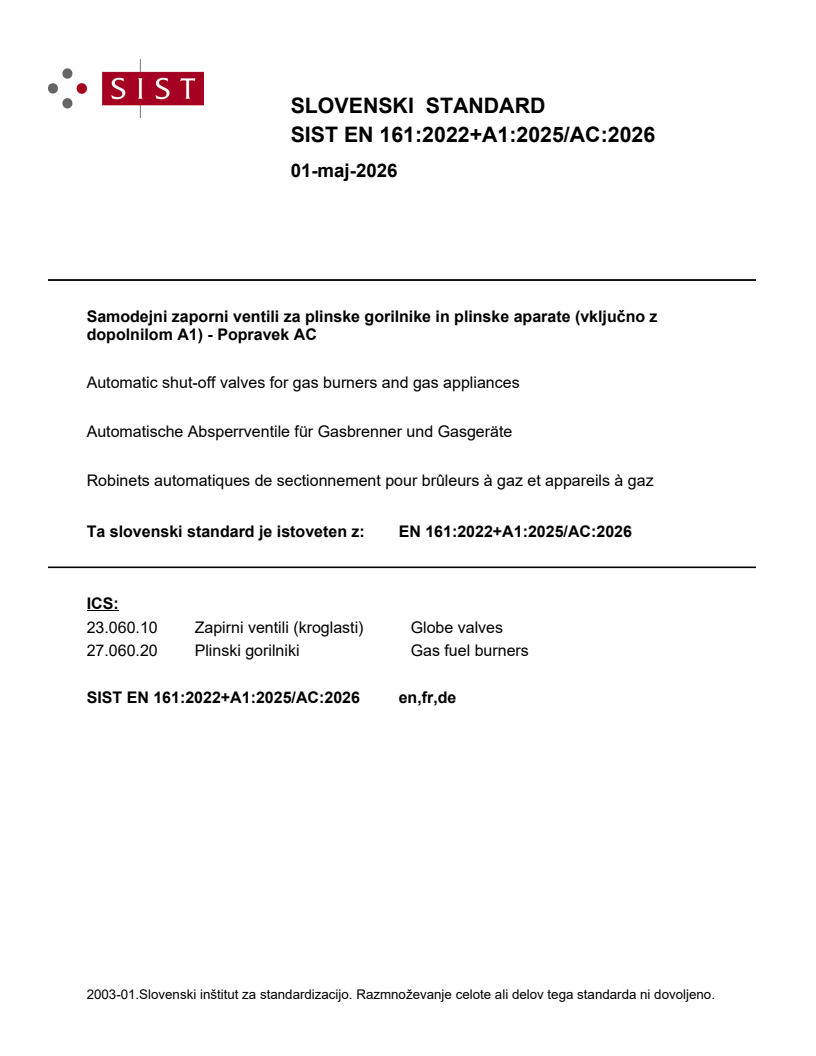 SIST EN 161:2022+A1:2025/AC:2026 is a corrigendum published by the Slovenian Institute for Standardization (SIST). Its full title is "Automatic shut-off valves for gas burners and gas appliances". This standard covers: Automatic shut-off valves for gas burners and gas appliances