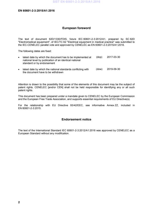 Notes: EN 60601-2-3:2015/A1:2016 is an amendment, not a full revision. Users should consult the base EN 60601-2-3:2015 text together with this amendment and check Annex ZZ for the relationship with EU directives (for example, medical device legislation references). For authoritative use, obtain the official CENELEC publication and national implementation texts.