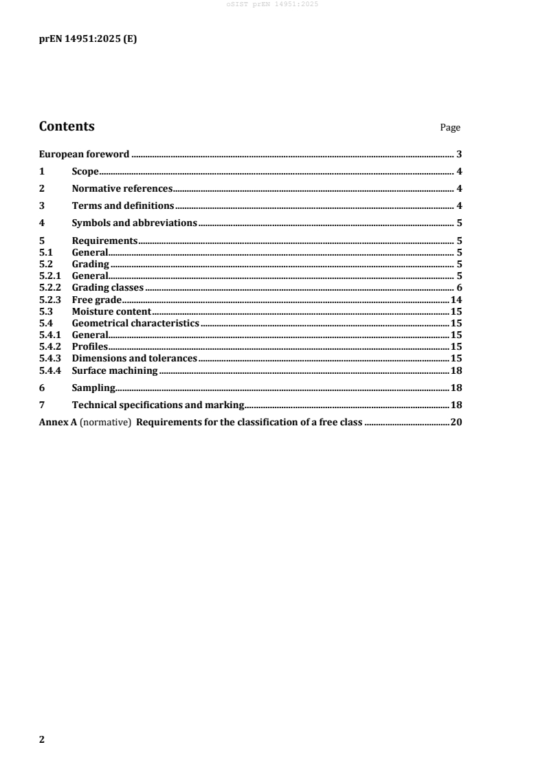 Notably, oSIST prEN 14951:2025:2025 focuses on product specifications and grading but does not cover treatment processes, surface coatings, or modifications. For additional regulatory requirements such as durability, fire reaction, or CE-marking under the Construction Products Regulation (CPR), the EN 14915 standard applies.