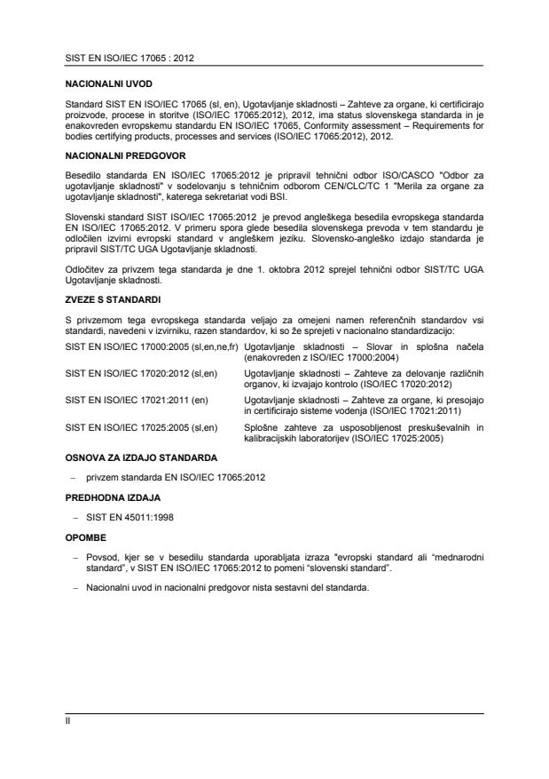 SIST EN ISO/IEC 17065:2012 is a standard published by the Slovenian Institute for Standardization (SIST). Its full title is "Conformity assessment - Requirements for bodies certifying products, processes and services (ISO/IEC 17065:2012)". This standard covers: 1.1 This International Standard contains principles and requirements for the competence, consistency and impartiality of the certification of products (including services; see clause 3.3 of ISO/IEC 17000) and processes and for the bodies providing those activities. Certification bodies operating to this International Standard need not offer all types of product, service or process certification. 1.2 Certification of products, services and processes is a third party conformity assessment activity (see clause 5.5 of ISO/IEC 17000:2004). Bodies performing this activity are therefore third party conformity assessment bodies, (named in this standard "certification body/bodies"). Note 1 A certification body can be non-governmental or governmental (with or without regulatory authority). Note 2 This International Standard can be used as a criteria document for accreditation or peer assessment or other assessment processes.