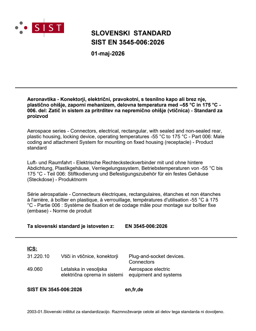 SIST EN 3545-006:2026 is a standard published by the Slovenian Institute for Standardization (SIST). Its full title is "Aerospace series - Connectors, electrical, rectangular, with sealed and non-sealed rear, plastic housing, locking device, operating temperatures -55 °C to 175 °C - Part 006: Male coding and attachment System for mounting on fixed housing (receptacle) - Product standard". This standard covers: This document specifies the male coding and attachment system for mounting on fixed housing in the family of rectangular electrical connectors with sealed and non-sealed rear, plastic housing, locking device, for operating temperatures from −55 °C to 175 °C.