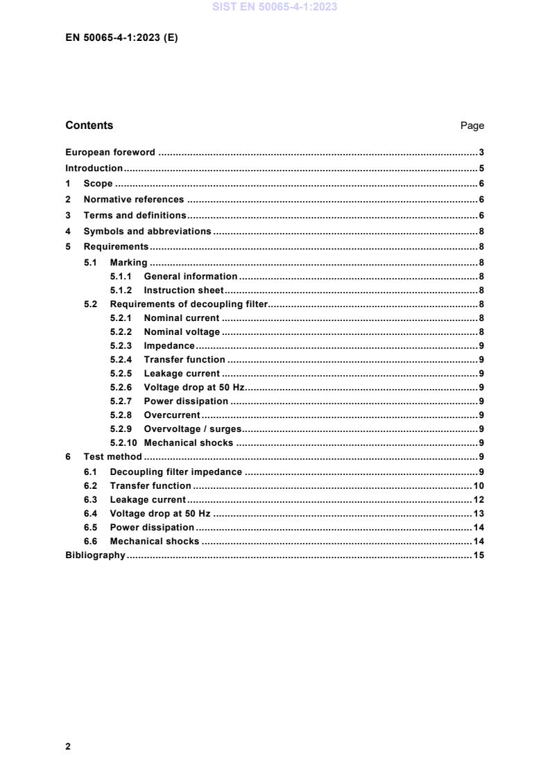 SIST EN 50065-4-1:2023 is a standard published by the Slovenian Institute for Standardization (SIST). Its full title is "Signalling on low-voltage electrical installations in the frequency range 3 kHz to 148,5 kHz Part 4-1: Low voltage decoupling filters - Generic specification". This standard covers: This document applies to decoupling filters installed on the low voltage mains network and operating in the frequency range 3 kHz to 148,5 kHz. It does not apply to EMI suppression filters incorporated in household equipment or other general electric equipment. It specifies the definitions, requirements and test methods of the functional, technical and environmental characteristics of the decoupling filter, e.g. impedance, transfer function, voltage drop, leakage current and power dissipation. The impedance and the transfer function are referred to the decoupling filter mains power ports (see Figure 1).