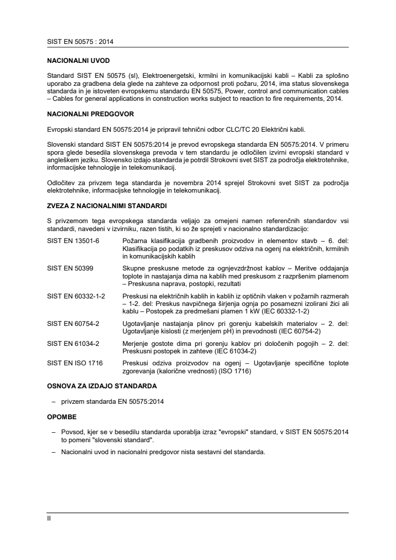 SIST EN 50575:2014 is a standard published by the Slovenian Institute for Standardization (SIST). Its full title is "Power, control and communication cables - Cables for general applications in construction works subject to reaction to fire requirements". This standard covers: This European Standard specifies reaction to fire performance requirements, test and assessment methods for electric cables used for the supply of electricity and for control and communication purposes, which are intended for use in construction works and subject to performance requirements on reaction to fire. The cables covered by this standard are intended to be used for the supply of electricity and communications in buildings and other civil engineering works with the objective of limiting the generation and spread of fire and smoke. Cables intended to be used for the supply of electricity, communication, and fire detection and alarm in buildings and other civil engineering works where it is essential to assure the continuity of power and/or signal supply of safety installations such as alarm, way guidance and fire fighting installations are not covered by this standard. NOTE This European Standard does not replace the electrical, mechanical and environmental requirements that are essential to demonstrate compliance with other applicable cable standards/specifications. This European Standard covers: - power cables - insulated conductors and cables for use in, e.g. the supply of electricity; - control and communication cables - wires, symmetric cables, and coaxial cables with metallic conductors for use in, e.g. telecommunication, data transmission, radio frequency, video communication and signalling and control equipment; - optical fibre cables - for use in, e.g. telecommunication, data transmission, radio frequency, video communication and signalling and control equipment.