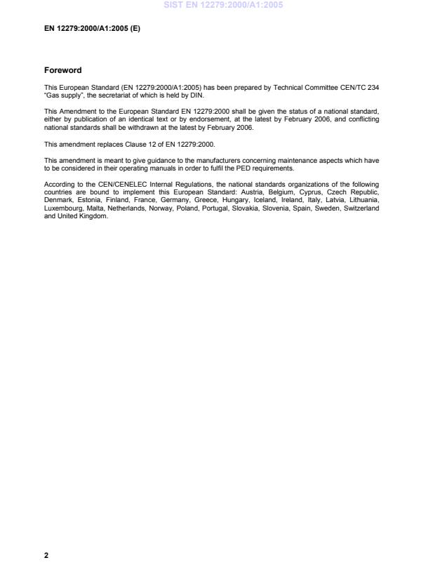 EN 12279:2000/A1:2005 is a CEN amendment to the European Standard EN 12279:2000 covering functional requirements for gas pressure regulating installations on service lines. This amendment replaces Clause 12 of the parent standard and provides guidance for manufacturers on maintenance aspects to help meet Pressure Equipment Directive (PED) obligations. The document is published in English, French and German and is intended for national standardization adoption across CEN member states.