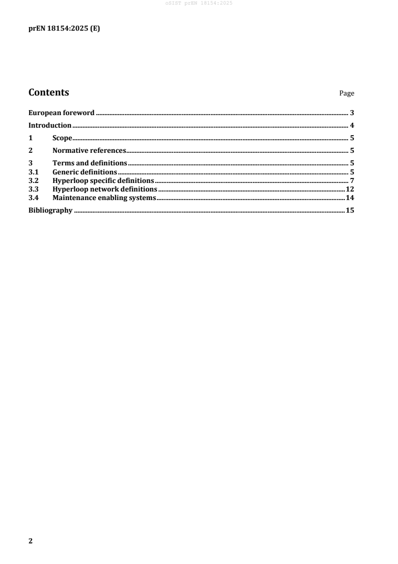 prEN 18154 - Hyperloop systems: Vocabulary and definition (CEN draft, Feb 2025) establishes a common nomenclature for Hyperloop technology. Produced by CEN/CLC/JTC 20 (secretariat NEN), this draft vocabulary is intended as the foundational reference for subsequent hyperloop standards and regulatory work. The document groups terms and definitions into four areas: generic definitions, hyperloop‑specific definitions, hyperloop network definitions, and maintenance enabling systems. It is published in English/French/German and is distributed for enquiry (not yet a final European Standard).