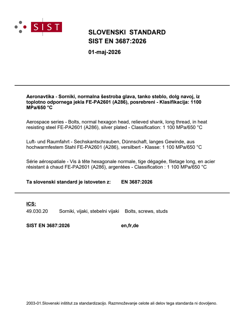 SIST EN 3687:2026 is a standard published by the Slovenian Institute for Standardization (SIST). Its full title is "Aerospace series - Bolts, normal hexagon head, relieved shank, long thread, in heat resisting steel FE-PA2601 (A286), silver plated - Classification: 1 100 MPa/650 °C". This standard covers: This document specifies the characteristics of silver-plated Bolts normal Hexagon Head with relieved shank and long thread, in heat resisting steel FE-PA92HT (A286), tensile strength class 1 100 MPa at room temperature. The maximum test temperature of the material is 650 °C.