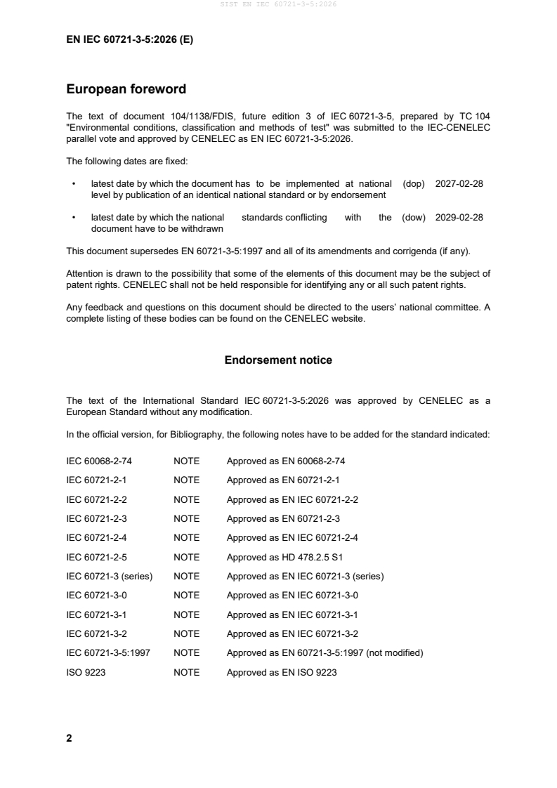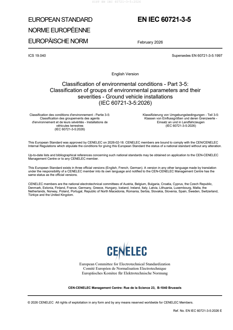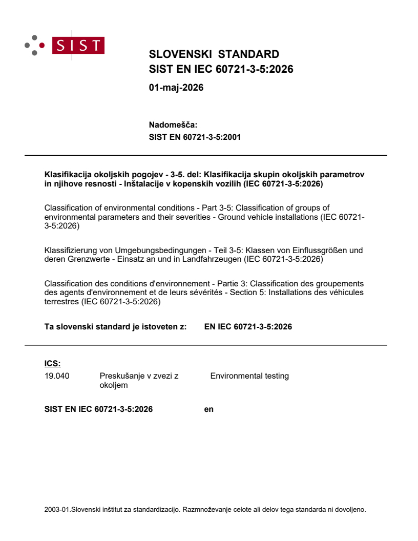 Klasifikacija okoljskih pogojev - 3-5. del: Klasifikacija skupin okoljskih parametrov in njihove resnosti - Inštalacije v kopenskih vozilih (IEC 60721-3-5:2026)