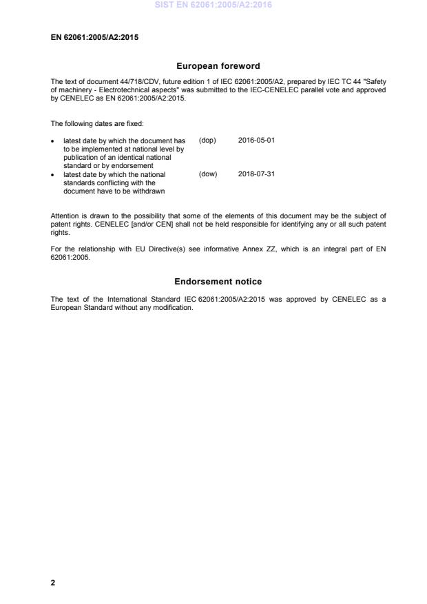 This amendment A2 modifies the European Standard EN 62061:2005; it was approved by CENELEC on 2015-07-31. CENELEC members
