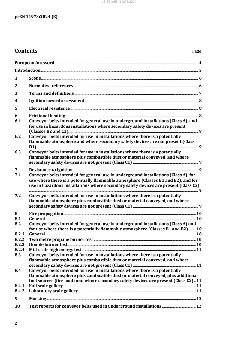 Keywords: oSIST prEN 14973:2024, conveyor belts, underground installations, electrical safety, flammability requirements, fire propagation, ignition hazard, mining safety, safety classification, risk assessment, CEN standard, hazardous atmospheres, combustible dust, secondary safety devices.