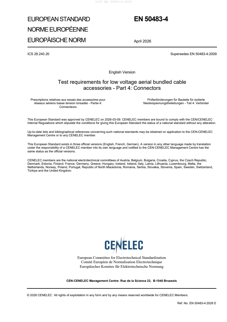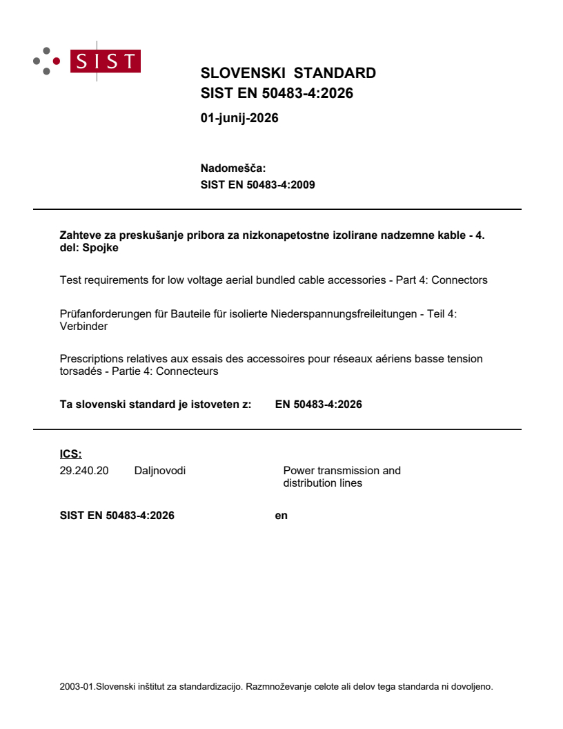 SIST EN 50483-4:2026 is a standard published by the Slovenian Institute for Standardization (SIST). Its full title is "Test requirements for low voltage aerial bundled cable accessories - Part 4: Connectors". This standard covers: The EN 50483 series applies to overhead line fittings for tensioning, supporting and connecting aerial bundled cables (ABC) of rated voltage U0/U (Um): 0,6/1 (1,2) kV. This document applies to connectors used for the electrical connection of ABC. The connectors are designed to be installed where either the main and/or branch cable is ABC as defined by HD 626 S2. Tests described in this document are type tests.